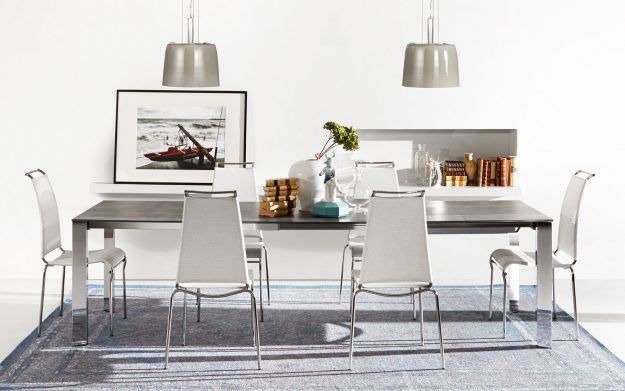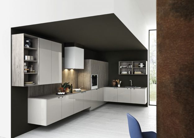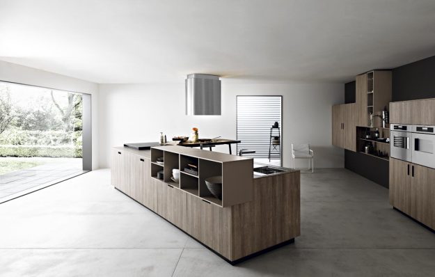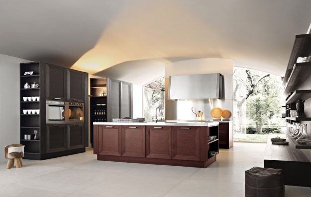 Cucine in legno con telaio da 9cm in massello Yellow Pine e pannello impiallacciato Yellow Pine spazzolato e laccato semitrasparente. Il prodotto in outlet è presentato in una composizione di metri 3,6 nella finitura Yellow Pine Granata e Magnolia