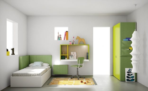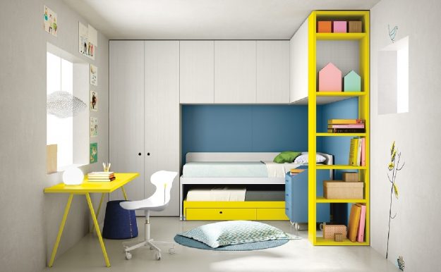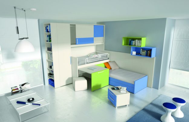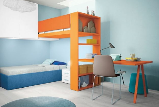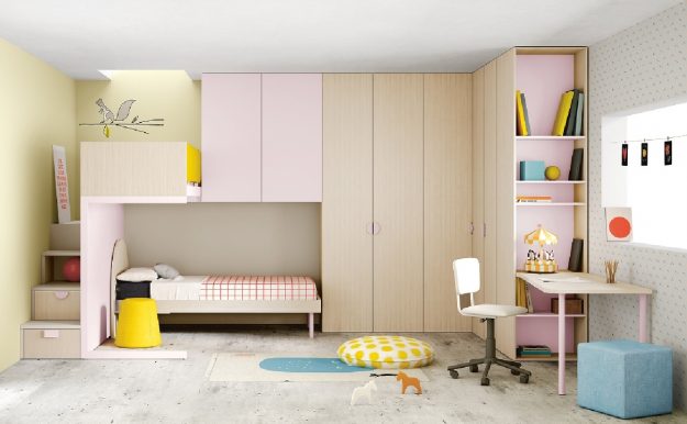 Cameretta moderna composta da elemento armadio, elemento ponte, letto a soppalco con fianco libreria e scrittoio, protezione, scaletta con cassetti, letto inferiore, comodino e sedia. Finiture utilizzate: bianco, ortensia e carota.