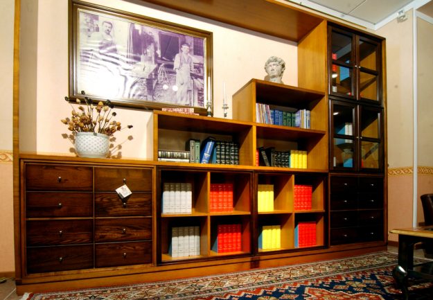 Libreria bicolore in ciliegio e frassino, lavorata massello con cassettiere, ante e vani a giorno. Per i clienti piu’ attenti a tematiche della Bioedilizia, si realizzano prodotti con lavorazioni particolari che prevedono la totale assenza di colle e vernici, pur garantendo l’assoluta qualita’ e robustezza che contraddistingue questi nostri prodotti.