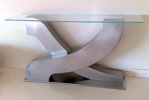 Un dispositivo di bloccaggio ne evita la chiusura accidentale. Il basamento a colonna in poliuretano, con un ampio foro centrale, e la piastra di appoggio in metallo garantiscono stabilità alla struttura. Il piano in vetro temperato può essere grigio fumè o trasparente extrachiaro, il basamento laccato nero opaco o bianco ottico lucido.